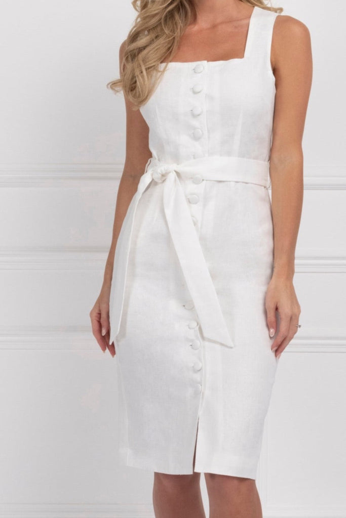 The perfect linen summer dress you have always longed for. Our button down linen dress is crafted from 100% luxury linen with a flattering square neck line and tailored body. Its pure cotton lining makes it comfortable to wear for any occasion, whilst its simple design with classic details, makes it the perfect blank canvas to add your own unique style.